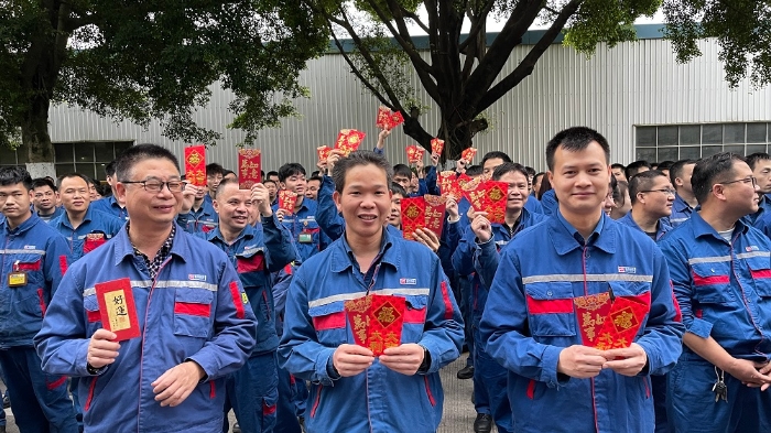 2月18日,旺财28船电举行开工仪式,两司高管亲临给员工拜年,送上龙年开工祝福。
